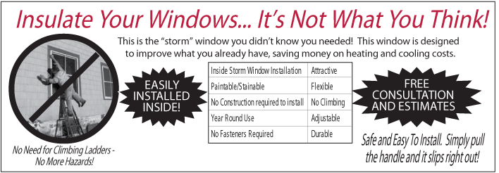 STORM WINDOWS: Our storm windows are designed to improve what you already have. New Windows can still lose needed heat, old windows can be drafty and inefficient. So if you want to save money on heating and cooling, as we all do, consider an easy, cost effective, sustainable way. After years of research and development, Tim designed a user friendly alternative to something that already existed, he didn't invent it, he simply made it better. Storm windows have been proven to be an excellent way to improve the efficiency of your home, now you can choose outside to install or inside installation.